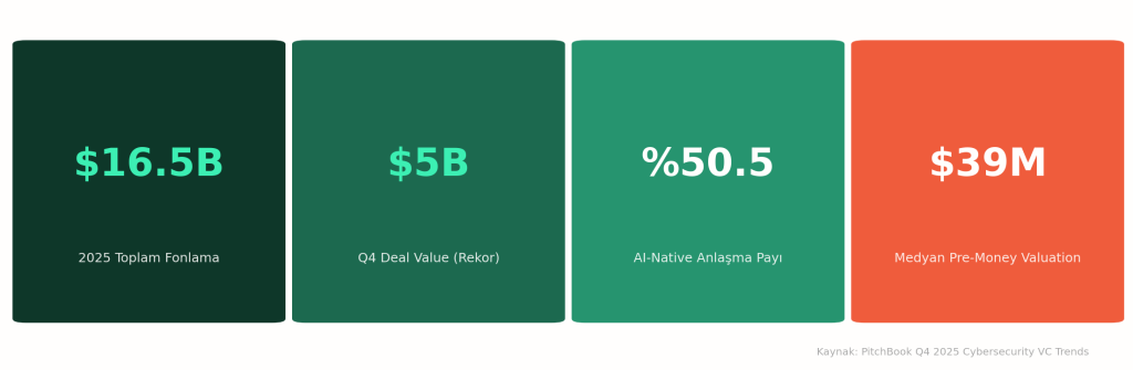 PitchBook’un Q4 2025 Cybersecurity VC Trends raporuna göre yıl boyunca 868 anlamaya toplam $16,5 milyar yatırıldı. Q4 tek başına $5 milyar yatırım yarattı; Q2 2022’den bu yana görülen en yüksek çeyreklik rakam. Ama aynı çeyrekte işlem sayısı 200’e geriledi; 2018’den bu yana en zayıf çeyrek.